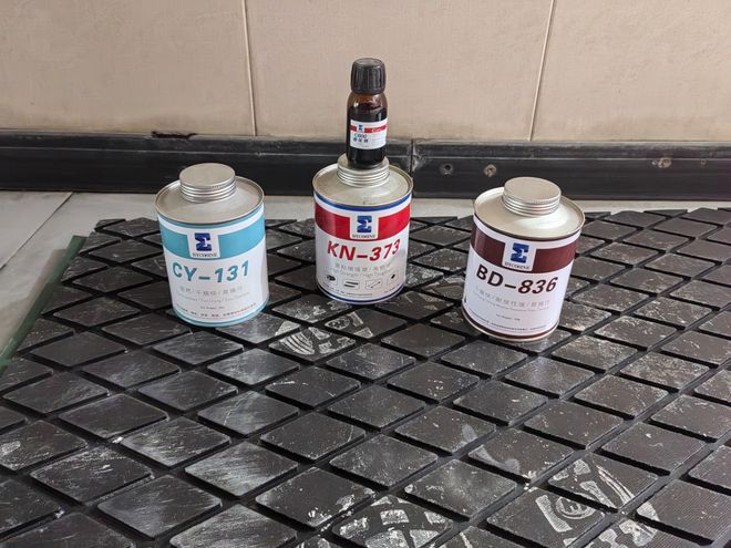 按比例混合 KN373 胶水与硬化剂,在滚筒表面和胶板背面各均匀涂刷两层。第一层胶微干后(约 15 分钟)再涂第二层,待胶膜呈半透明状(不粘手)即可贴合。