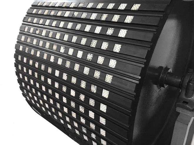 当输送量处于中等水平,即每小时 100-500 吨之间时,滚筒需要承受更大的压力和摩擦力。此时,建议选择 10-12mm 厚度的胶板。10mm 厚度的胶板具有一定的耐磨性和抗冲击能力,能应对一般的物料冲击;而在输送量接近 500 吨 / 小时,或者物料颗粒稍大、硬度较高时,12mm 厚的胶板则更为合适。像在输送破碎后的煤块等物料时,12mm 厚的胶板可有效抵御物料对滚筒表面的磨损,保障滚筒稳定运行,延长其维护周期。