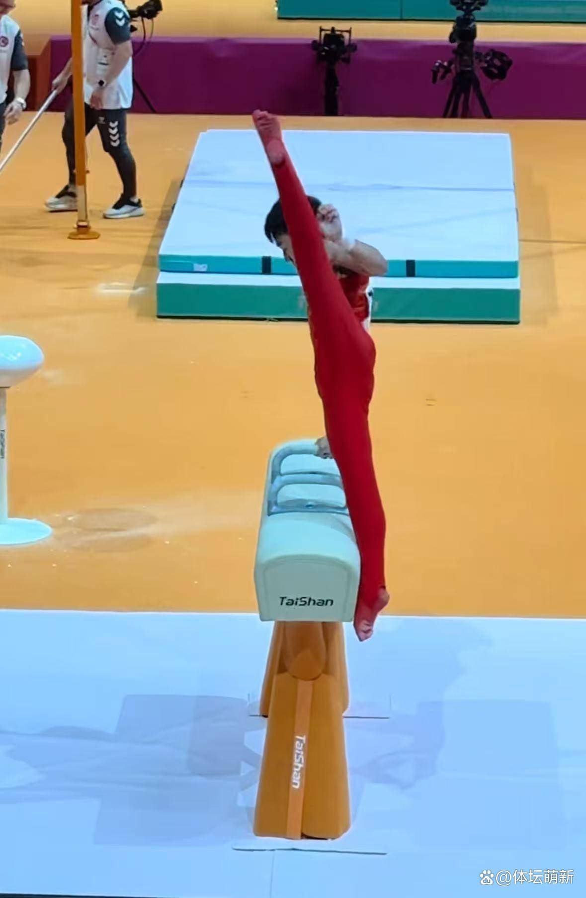 起势、摆腿、全旋——洪延明的身体在鞍马上方划出一道道银色的弧线,每个分腿动作都像圆规画出来的一样标准。最惊艳的是他的“交叉腿全旋接俄式挺身转体1080度”,当身体在空中转出第三个圈时,现场观众忍不住发出“哇”的惊呼。落地时,他的脚尖像钉在地板上一样纹丝不动,举起双手的刹那,教练席已经炸开了锅——中国教练们抱作一团,连隔壁日本队的教练都忍不住拍了拍手。