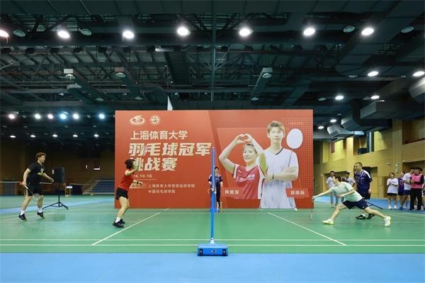 “冠军思政课”课后,黄雅琼、刘雨辰与师生互动,开展羽毛球混双冠军挑战赛。上海体育大学供图